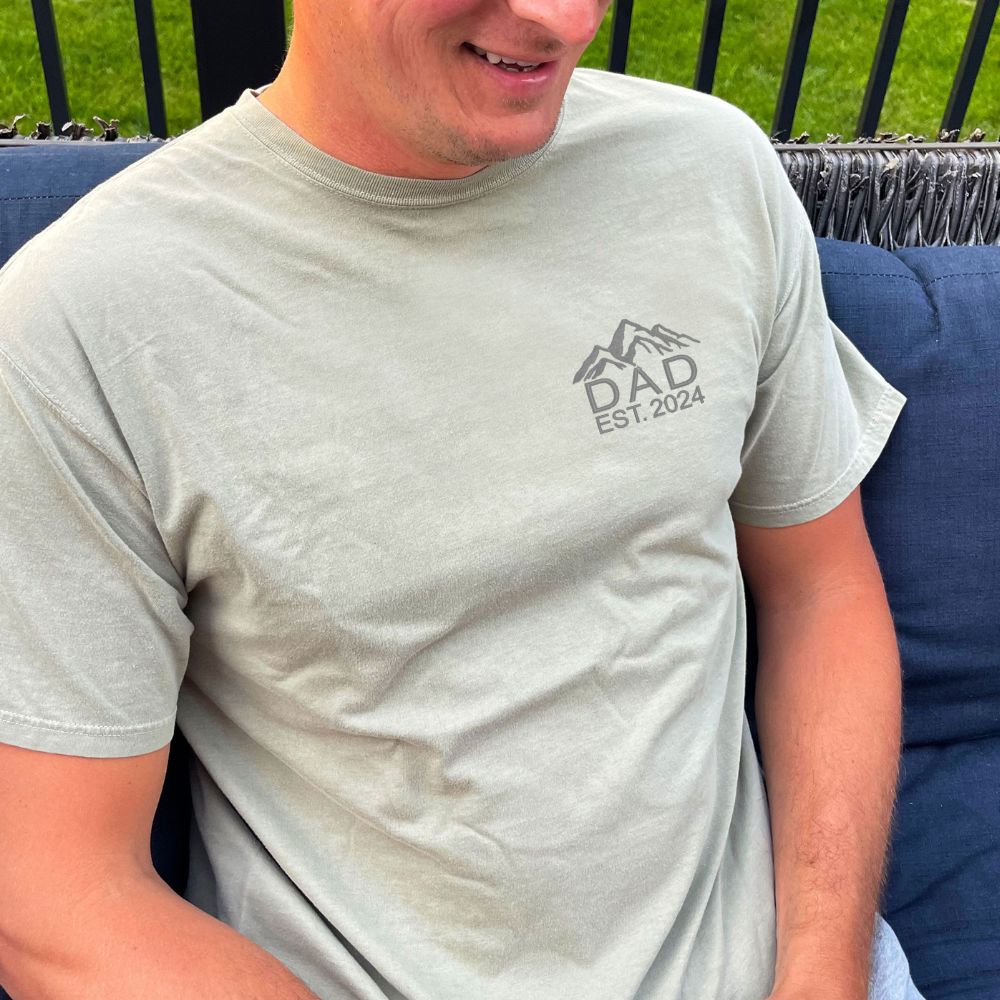 Celebrate his greatest adventure—becoming Dad—with this embroidered mountain Comfort Colors T-shirt. Featuring a detailed custom year and minimalist mountain design, this personalized tee is the perfect gift for outdoorsy dads, hikers, and nature-loving grandpas. A thoughtful, wearable keepsake he’ll reach for again and again!