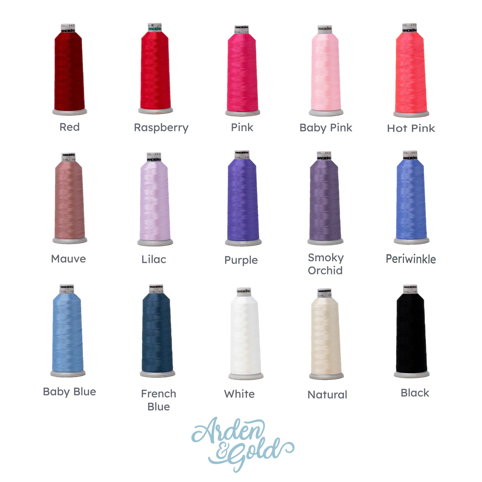 Allie is wearing a White sweatshirt with Baby Pink thread. Other samples are show as Sand with White thread and Heather Oatmeal with Mauve thread.
