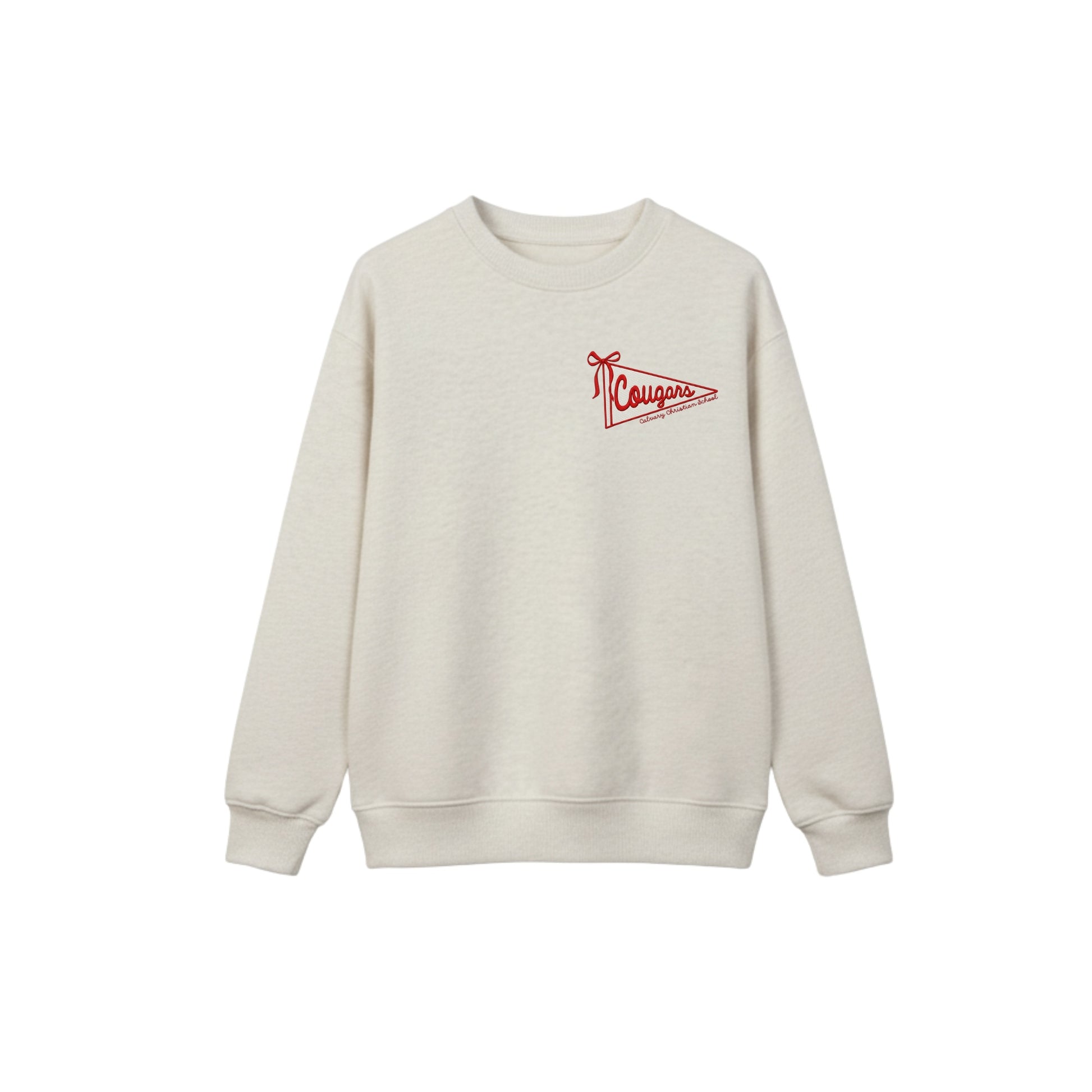 Show your school pride with this adorable youth crewneck sweatshirt, featuring a custom embroidered Cougars pennant design. Perfect for game days or everyday wear, this spirited piece celebrates your team in style. Soft, comfortable fabric keeps you cozy while the eye-catching embroidered bow detail adds a cute, playful touch!