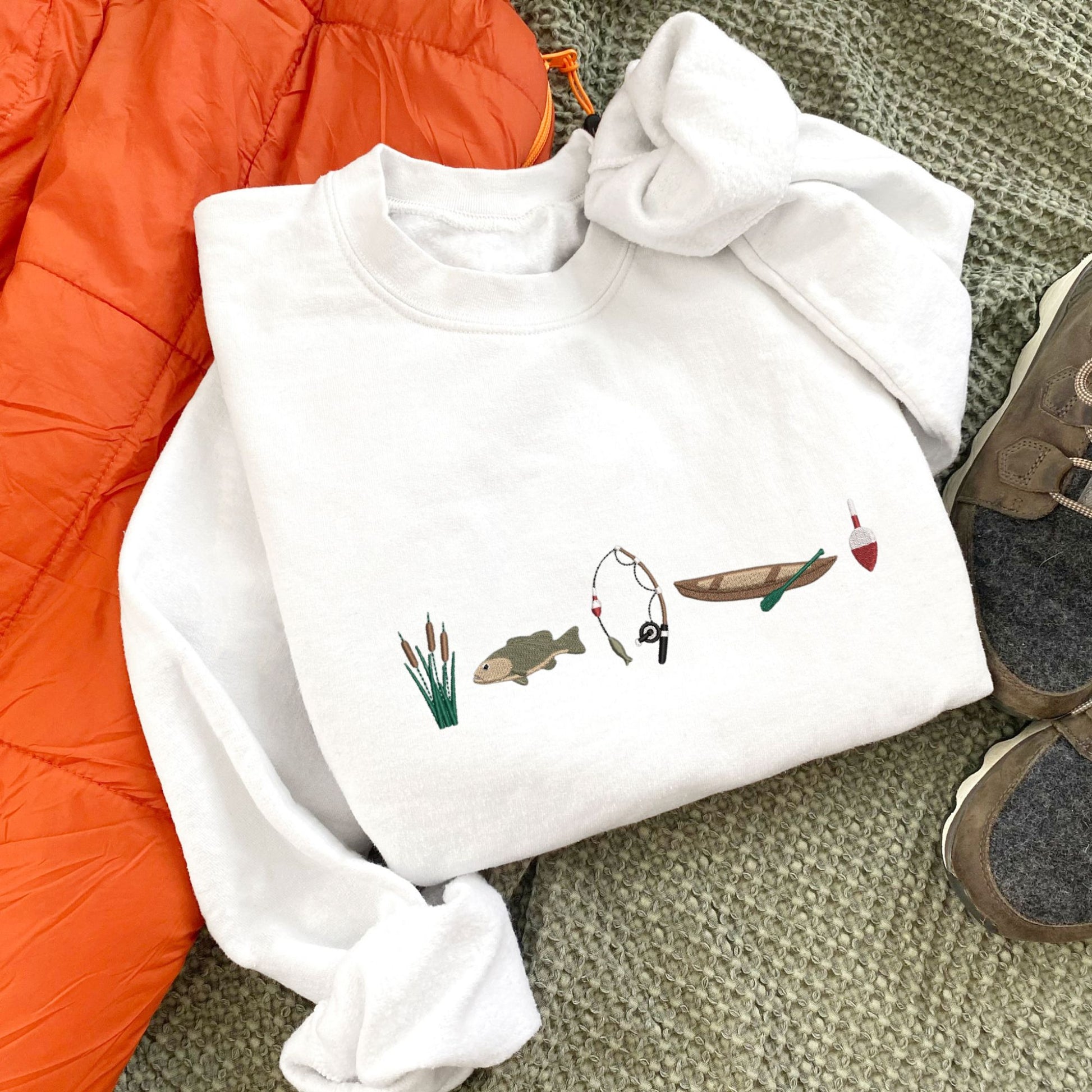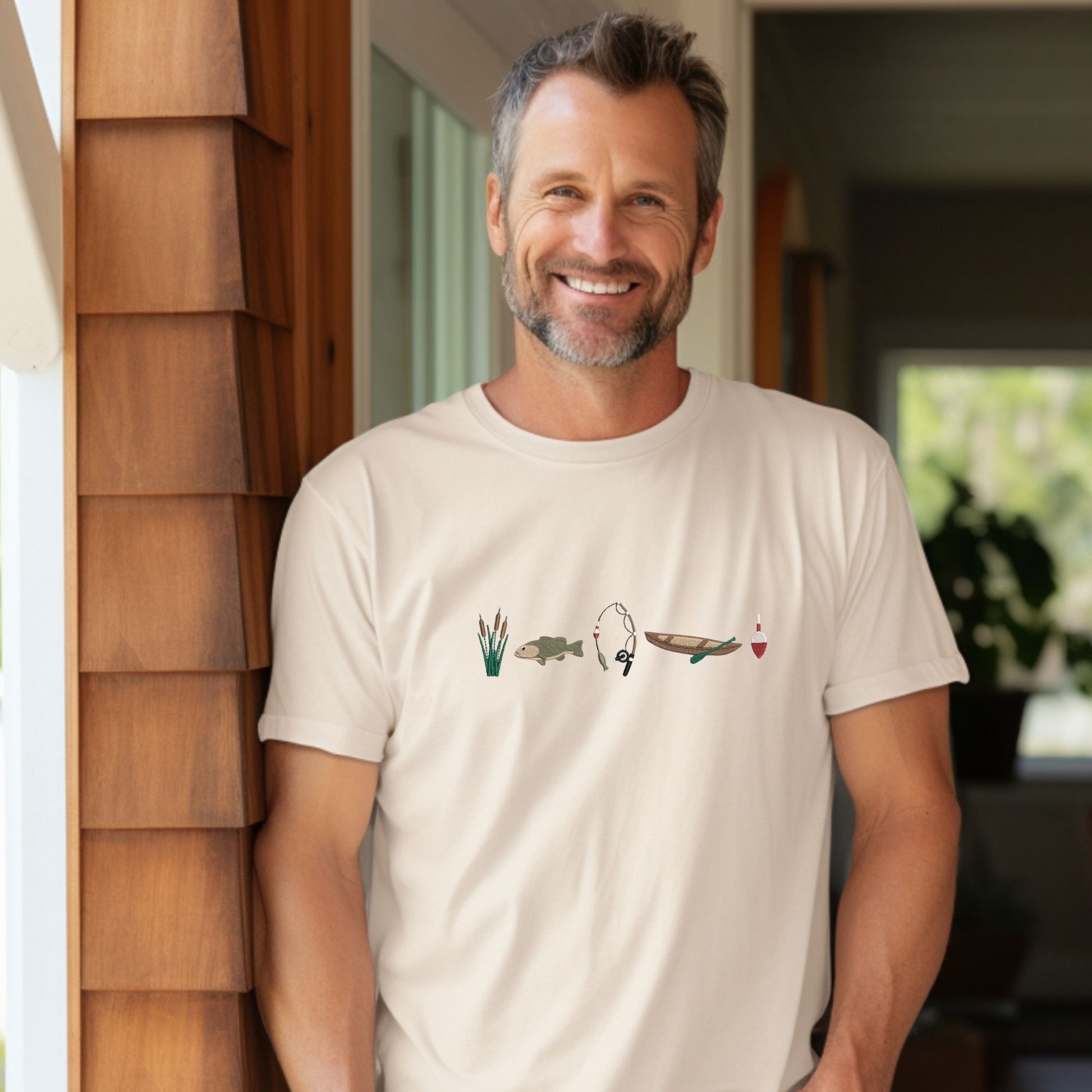 Looking for the perfect gift for the fisherman in your life? This Comfort Colors embroidered t-shirt -- or crewneck sweatshirt!! -- features a set of fishing icons – cattails, bass fish, fishing rod, canoe, and bobber – stitched in earthy tones for a subtle yet stylish nod to lake life! Whether you're casting off at sunrise or relaxing on the dock, this shirt brings the outdoors to your everyday wardrobe.