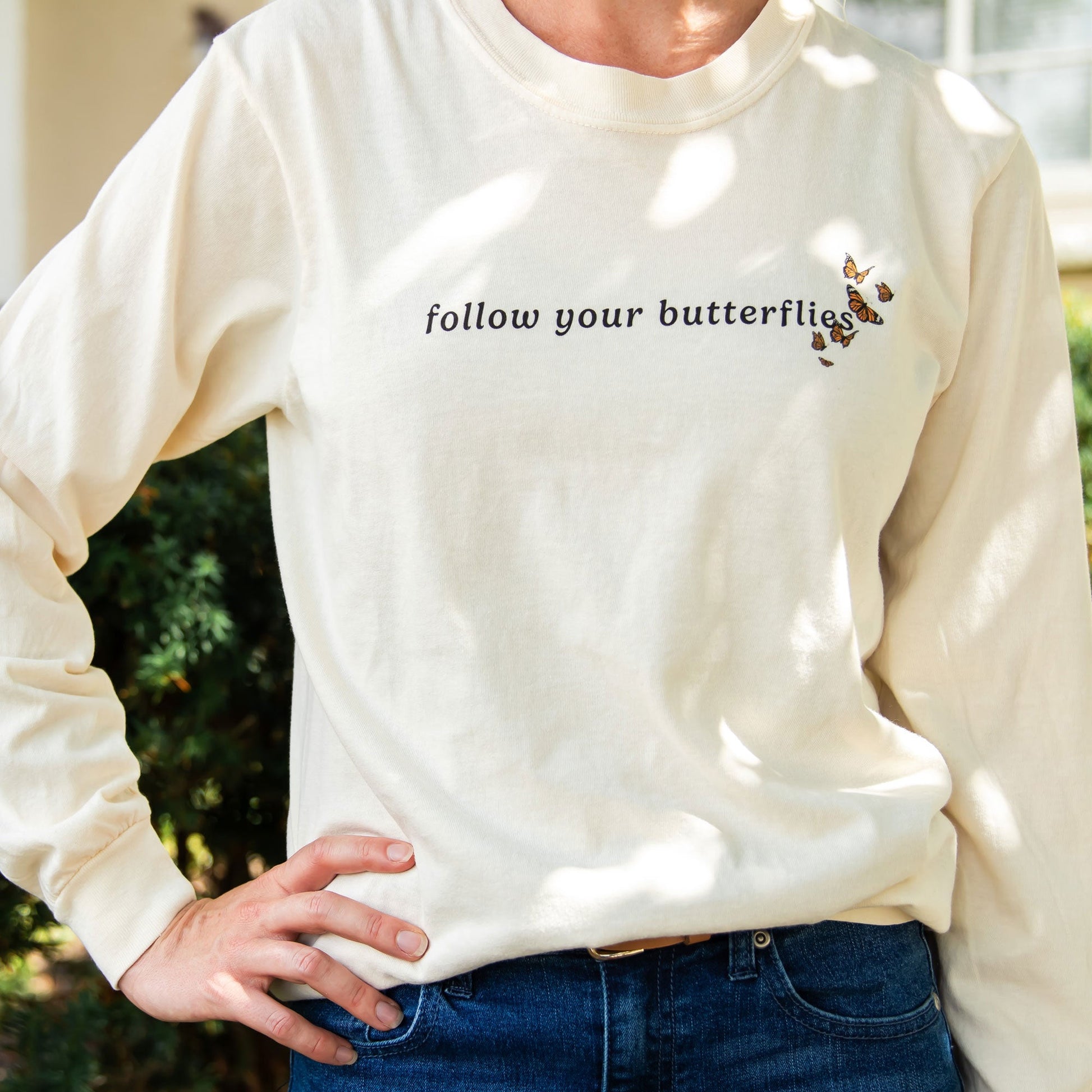 Unleash your inner-free spirit and Follow Your Butterflies in this cozy long sleeve Comfort Colors tee! Featuring a small butterfly design and an inspiring quote reading "Follow Your Butterflies", it's the perfect way to make a statement wherever you go!