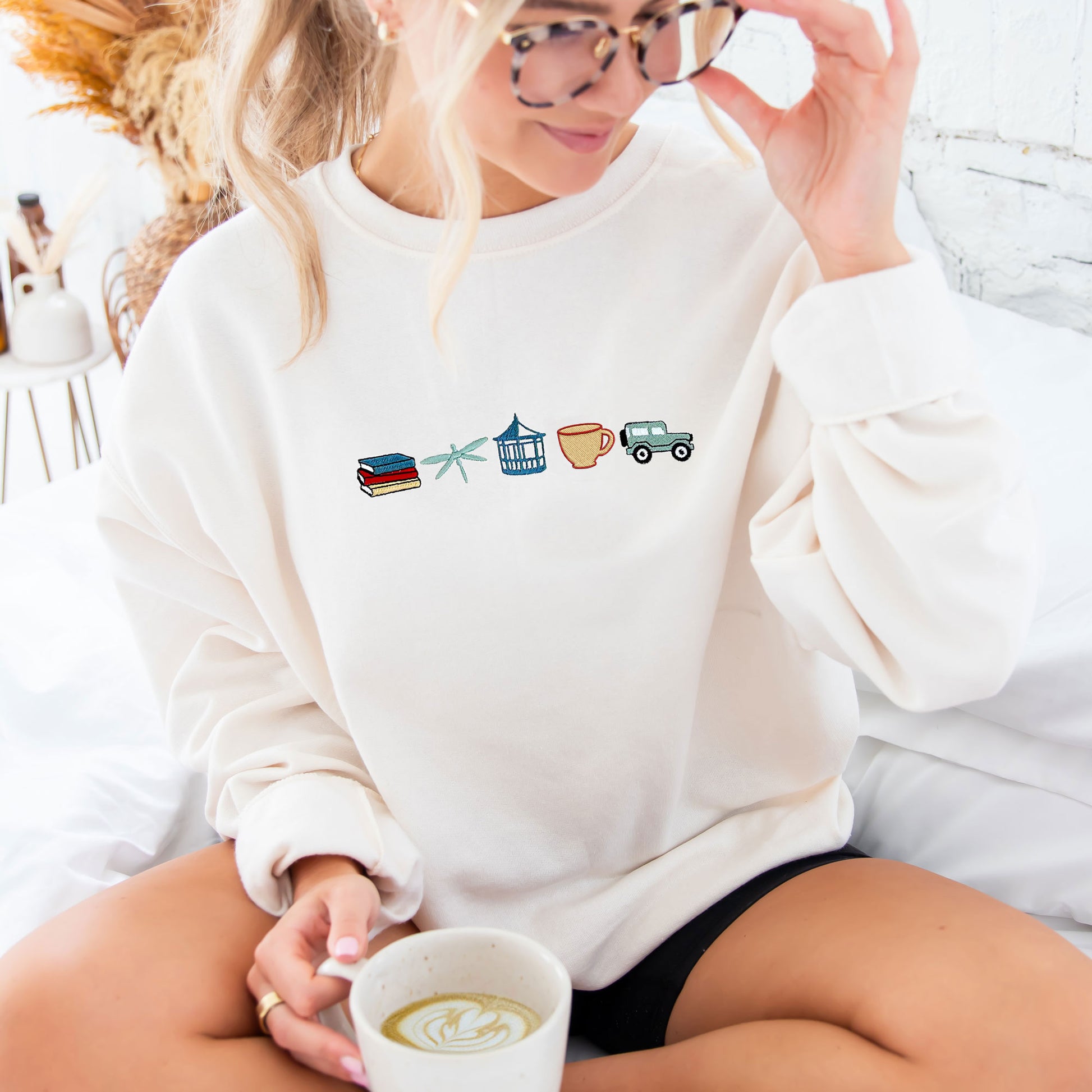 Snuggle up in style with our fan-favorite cozy fall TV show Icons Embroidered Gemma Crewneck Sweatshirt! Perfect for fans of the iconic show, this cozy autumn crew features embroidered icons of beloved show symbols. Size Up for the coziest fit and enjoy wearing this while watching your favorite fall shows this fall!
