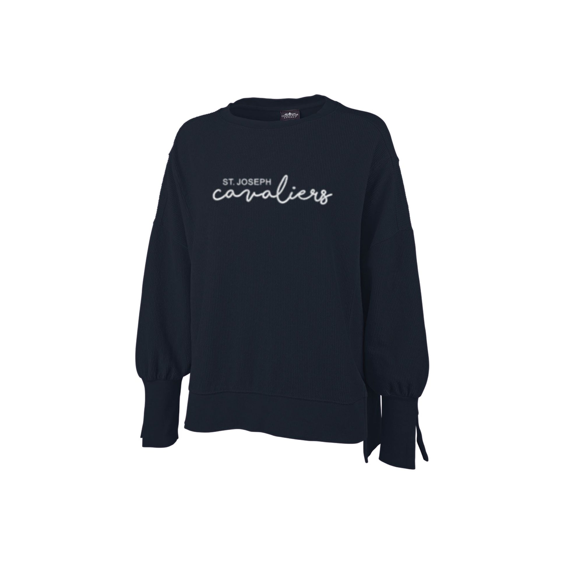 This ladies corded cropped pullover crew is perfect for showing off your St. Joseph school spirit! With a boxy fit, split hem, and a fun cursive embroidered cavaliers design, this pullover offers both style and comfort!