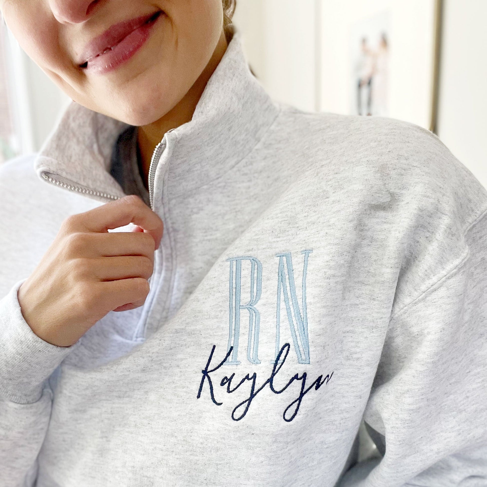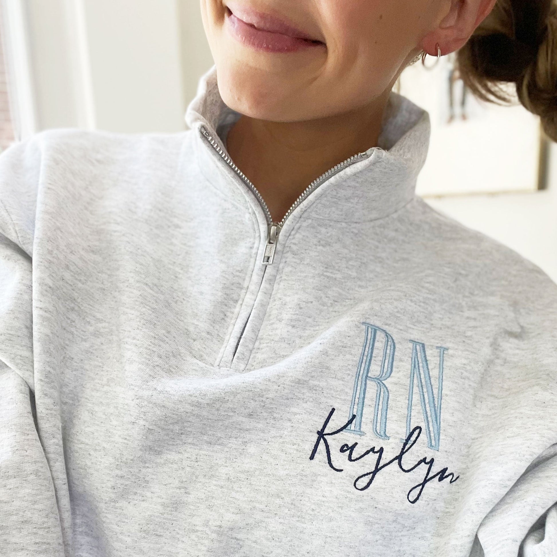 Kaylyn is a size 4-6 and is 5'5" tall, and she is wearing a LARGE quarter zip from our Jessie Collection. Sample shown in ASH with BABY BLUE thread (RN) and NAVY thread (name).