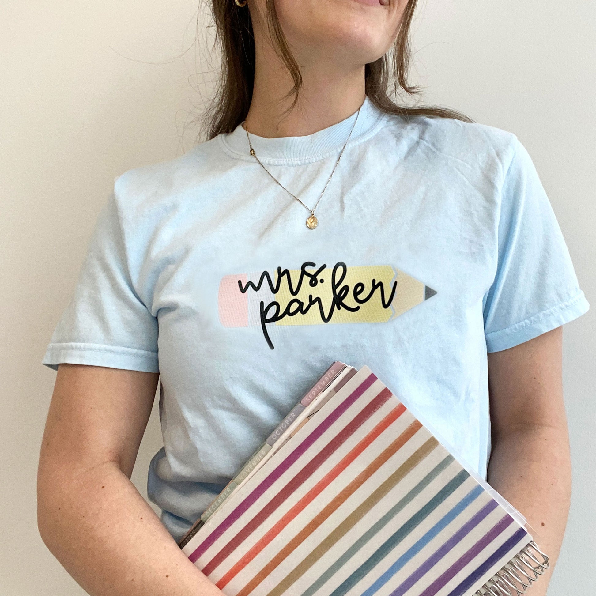 Show off your teacher pride with our Comfort Colors Personalized Teacher Pencil T-Shirt. Perfect for Teacher Week or as a gift, this customizable tee is both comfortable and stylish. Available in a variety of colors!