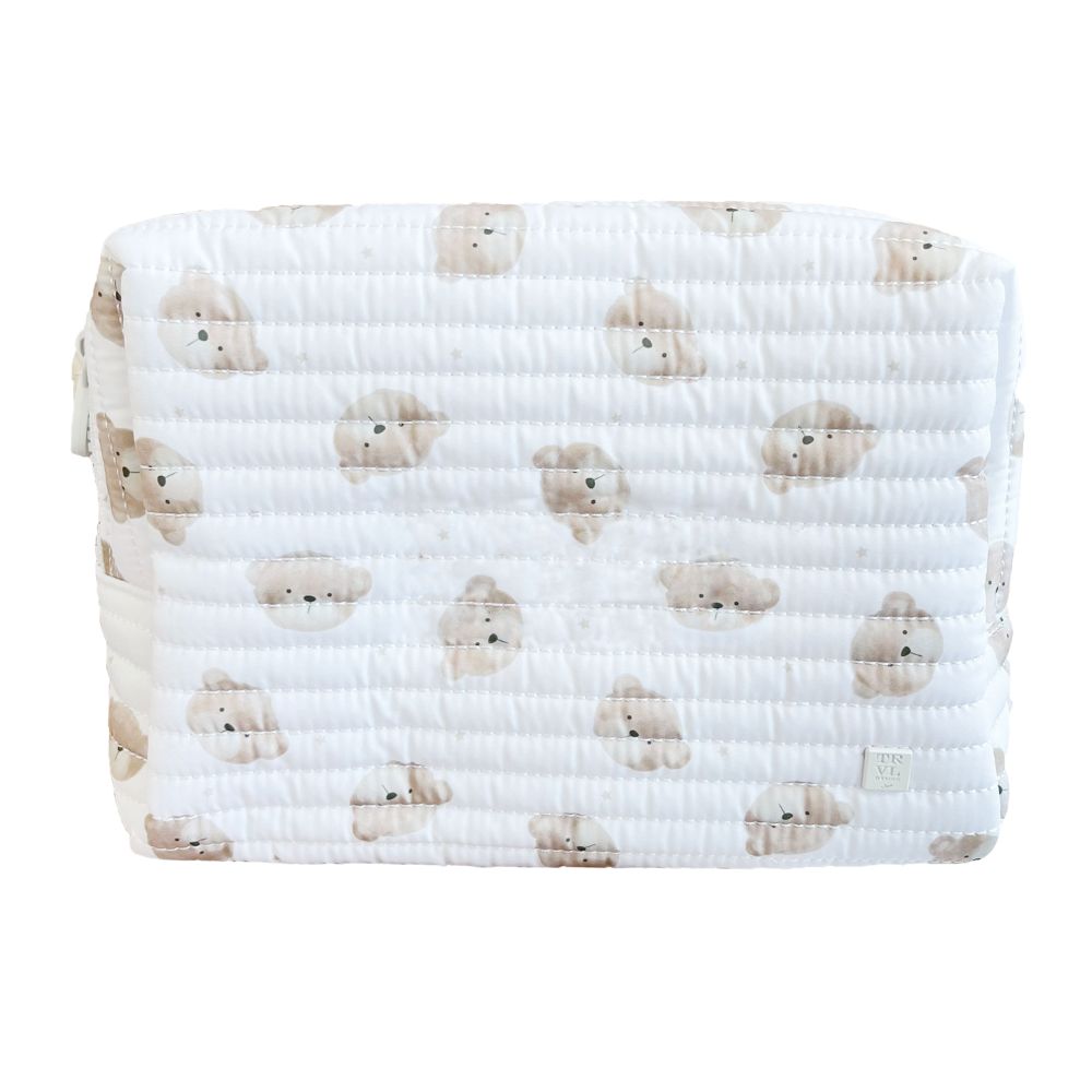 This cute and functional pouch is the perfect gift for a new mom and baby on-the-go! It features a cute teddy bear pattern and is roomy enough for snacks, diapers, toys, and more. It also includes an interior pouch for organizing essentials. Personalize it for a special touch!