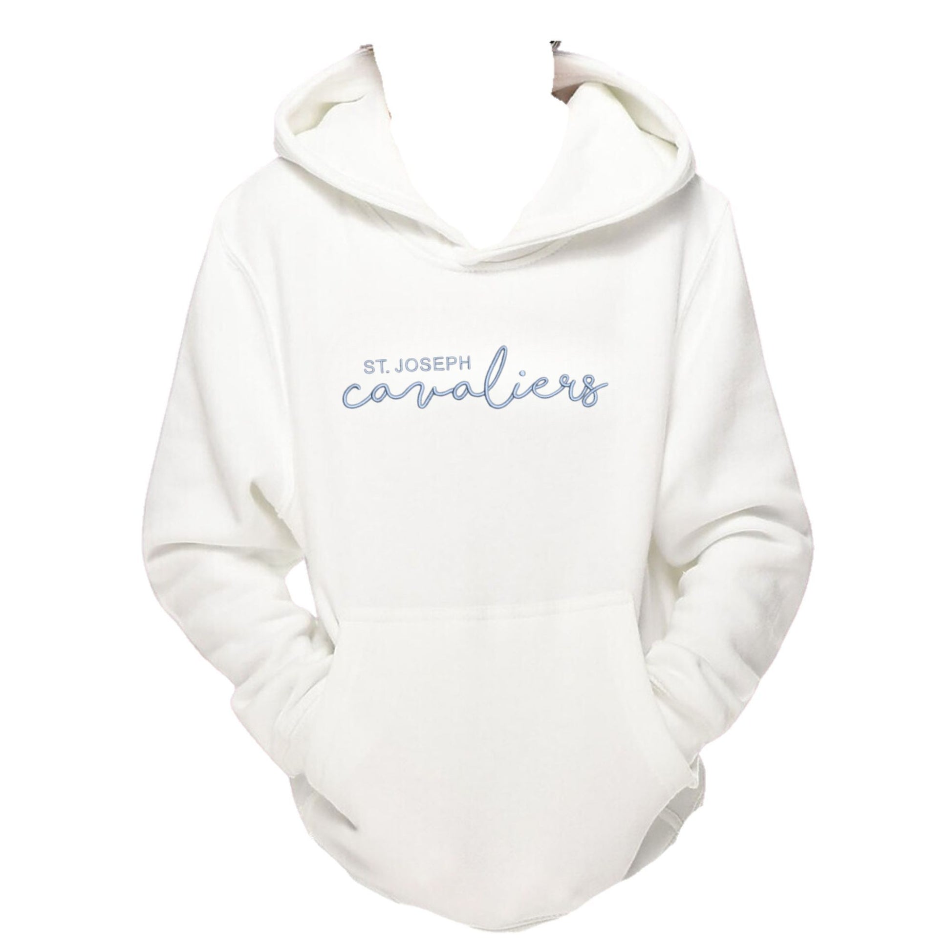 This Youth St. Joseph Cavaliers Script Embroidered Hoodie Sweatshirt features a a fun embroidered design, offering a cheerful and new look for young Cavaliers! Made for comfort and durability, this hoodie is perfect for school events, sports games, or everyday wear.